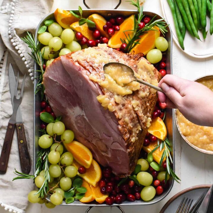 This Baked Ham with Pineapple Sauce is a show-stopping centerpiece for your holiday menu. Classic spiral sliced ham is served with a tangy and sweet pineapple sauce.