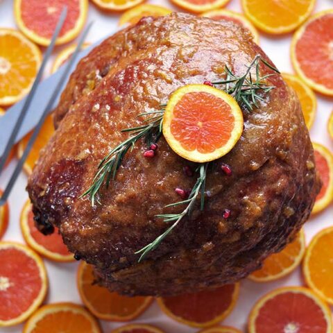 Baked Ham with Citrus Glaze is a delicious recipe for making a holiday ham. The delicious glaze is made with orange juice, mustard, brown sugar, and ground cloves.