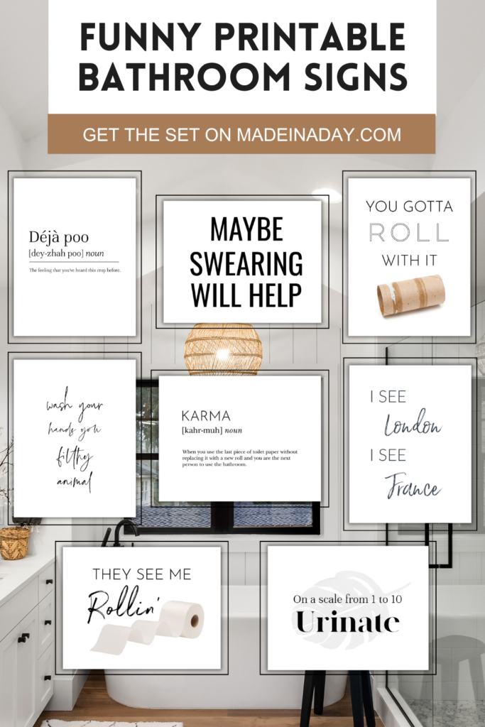 Brighten up your bathroom with stylish, free funny printable bathroom signs that guests will love. These prints make decorating simple, fun, and full of personality. Just print and frame! For more great prints, see my Printables page.