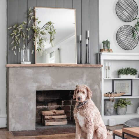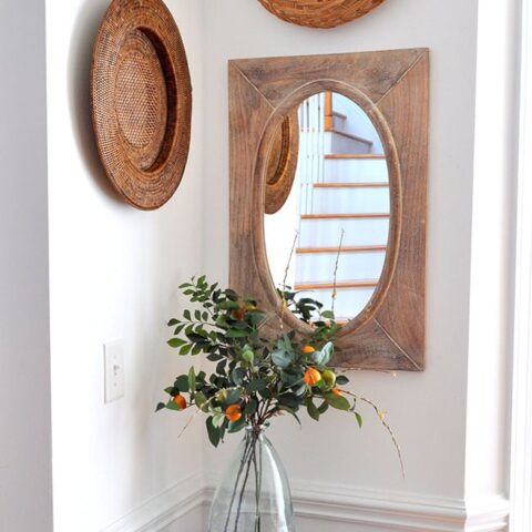 Usher in the sunshine and warm weather with this Minimalist Spring Mantel Decor featuring a large accent mirror and greenery with a Modern Rustic Vibe!