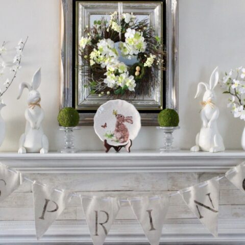 Farmhouse spring mantle with sweet bunnies and a DIY banner.