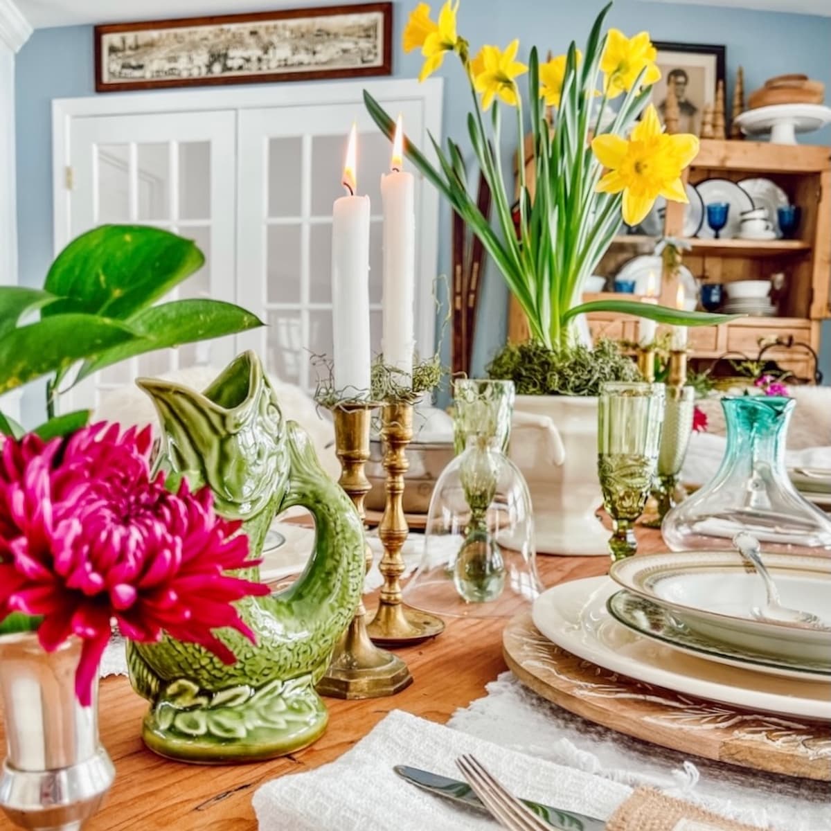 Spring Tablescape with Daffodils: Irish Green Table Decorations with Vintage Layers