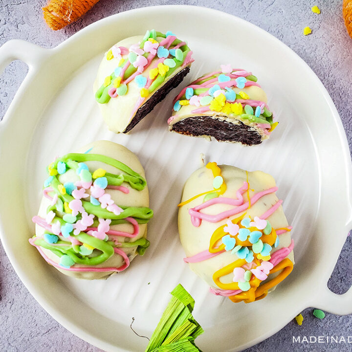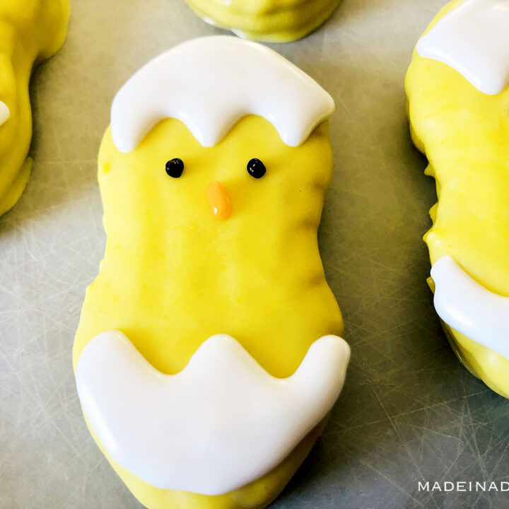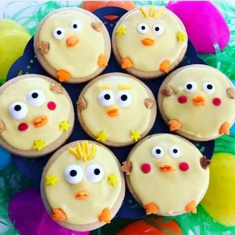 There are simple cut-out sugar cookies frosted with buttercream or covered in chocolate. Or, try an easy semi-homemade cookie like my Nutter Butter chocolate dipped chick cookies.