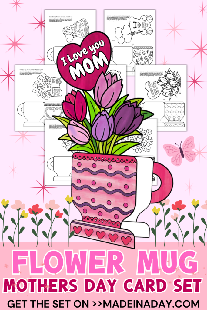 Okay, this one is just the sweetest little project. And honestly, it might melt your heart a bit. This free Flower Mug Mother’s Day Cards Set is such a fun paper craft for kids to color, put together, and gift to mom.