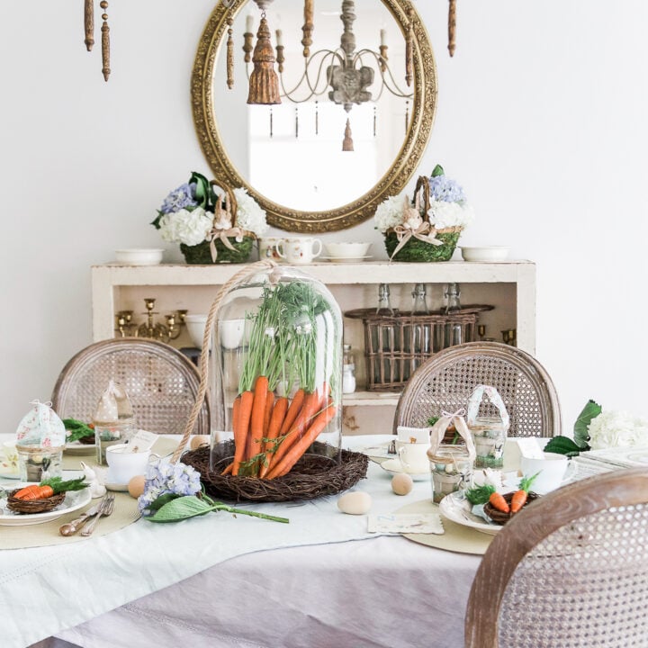 This Easter table setting inspired by Peter Rabbit is so beautiful. So many sweet design elements like the carrots under the cloche.