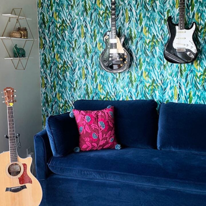 I have always wanted to try making over a room with wallpaper, but my husband, who has nightmares of bad 1970’s floral walls of his youth, refused to let me. Several weeks ago I did a review post on my Tidal Blue Velvet Sofa. When I received the sofa, I knew the space it was in needed an extra color punch to it.