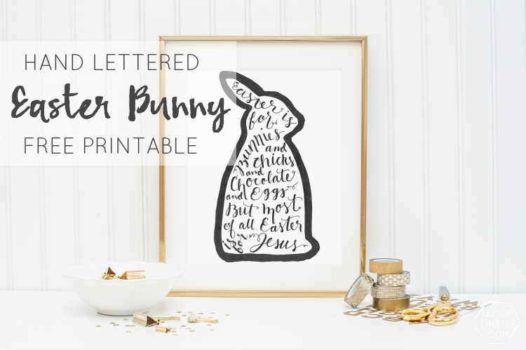 This free Easter Printable says 'Easter is for Bunnies and chicks and chocolate and eggs but most of all is for Jesus. Hand lettered in black ink.