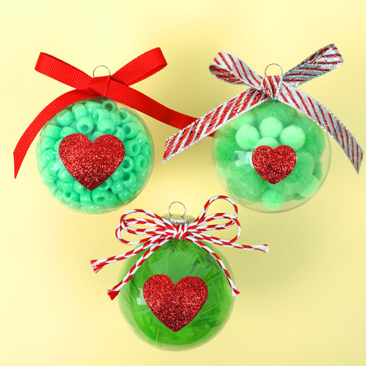 Homemade grinch ornaments are an easy and cute way to decorate your tree in a theme this year!