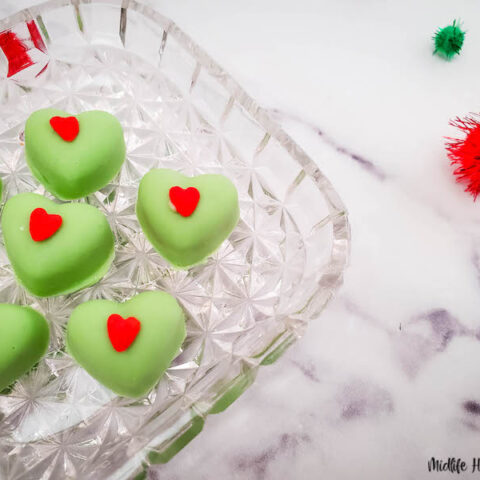 Cute Grinch cupcakes with easy candy melt hearts!