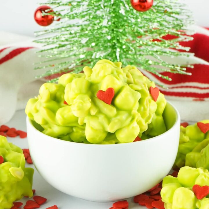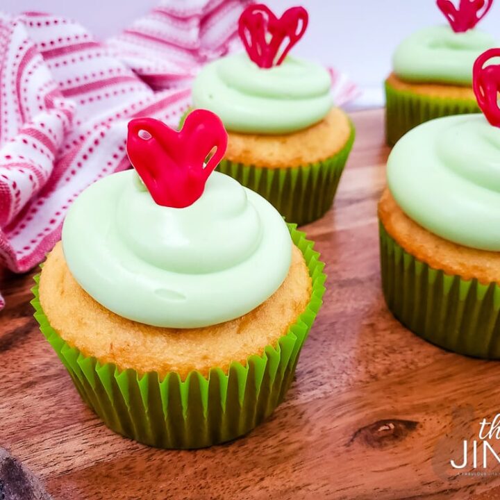 These fun and festive Grinch Cupcakes are made with a creamy Peppermint Frosting and topped with an adorable “Whoville” tree! They’re the perfect treat to enjoy during the holidays.