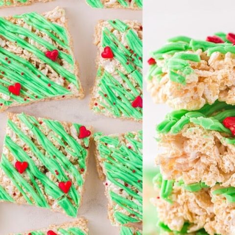 Easy to make soft and sweet Christmas cereal treats with green icing and red hearts for the Grinch!