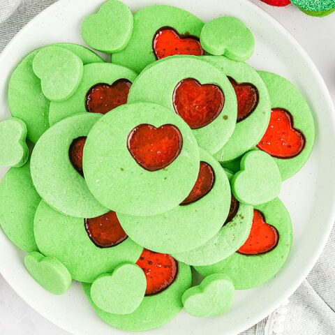Heart shaped stained glass window Grinch heart cookies is made with crushed hard candy.