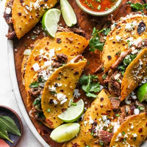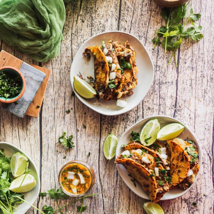 Birria Tacos (or Quesatacos) are made with tender beef, a rich adobo sauce, and earthy corn tortillas! Once pan-fried to crisp perfection, these tacos are repeatedly dipped into broth.