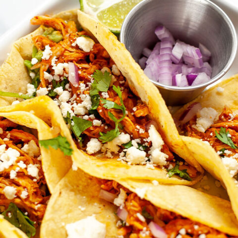 Beef barbacoa tacos recipe is made in a pressure cooker and served with homemade pickled onions.