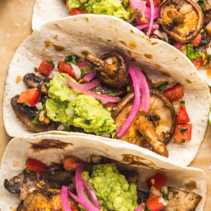Mushrooms with pico de gallo, creamy guacamole, and crunchy quick pickled onions.