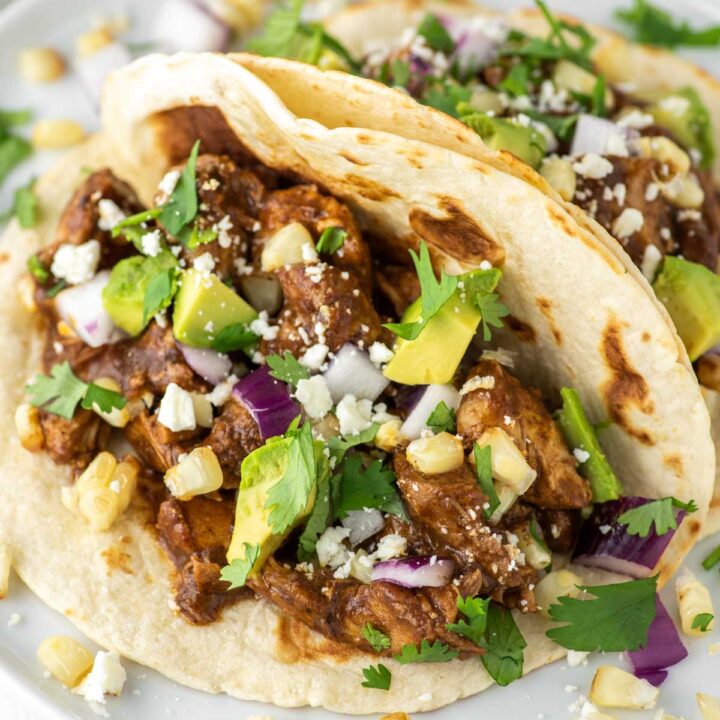 Chicken tacos are made with chicken thighs tossed in an easy mole sauce and topped with your favorite fixings.