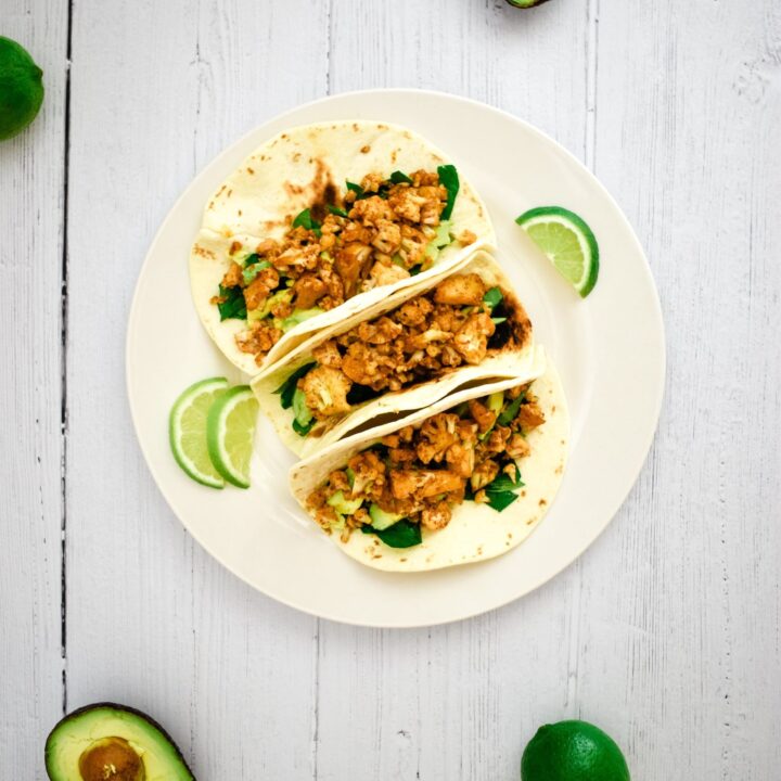 Cauliflower tossed in the taco seasoning and served with veggies.