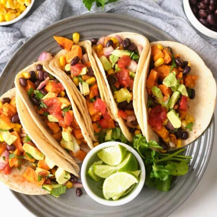 Loaded with tender sweet potatoes, tasty black beans, corn, fresh toppings, and garnished with lime.