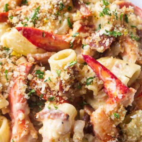 Lobster pasta blends a creamy garlic sauce with a crispy topping of lemon garlic panko bread crumbs.