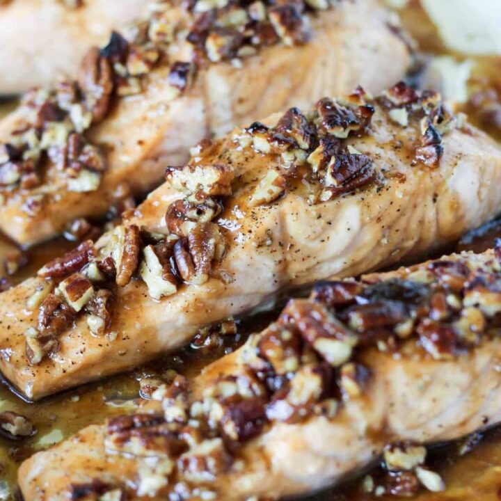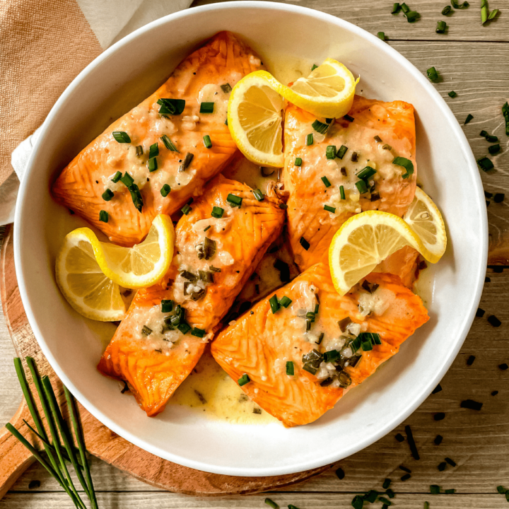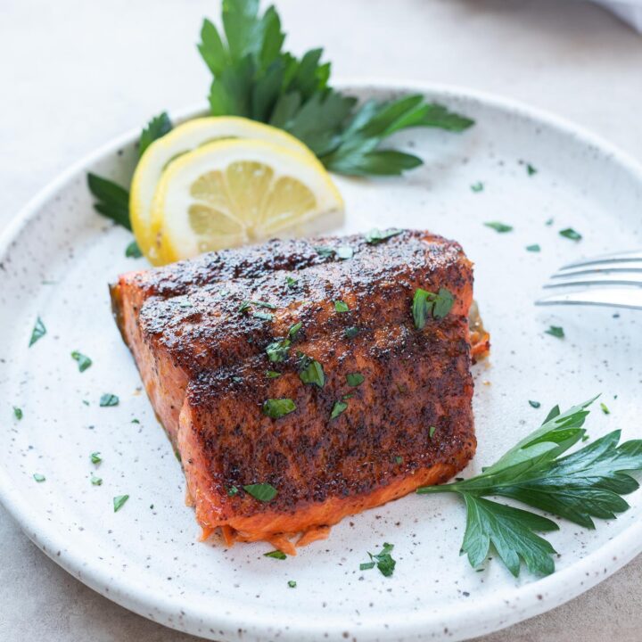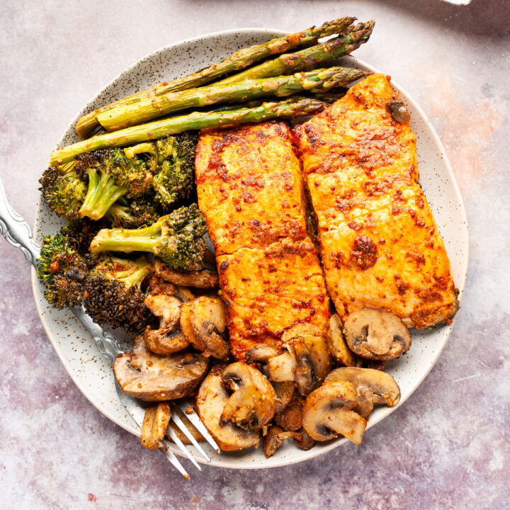 Salmon is a delicious and healthy dish that can be enjoyed for lunch or dinner. We love it for lunch in salads and served with rice and Brussels sprouts for dinner.