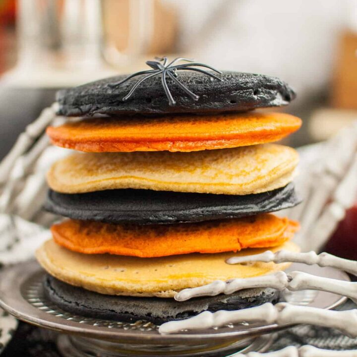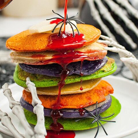 Made with just a few simple ingredients (and food coloring), they come together in a snap and will be loved by kids and adults alike. Top them with your favorite syrup, fresh fruit, or even some Halloween candy for an extra-special treat.