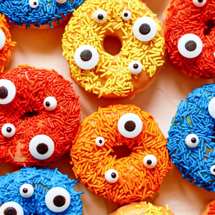Make your own custom Halloween Donuts using store-bought donuts, sprinkles and candy eyes.