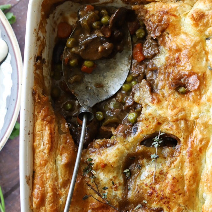 This puff pastry meat pie is packed full of veggies, tender beef and simmered in the most delicious Guinness beer gravy.