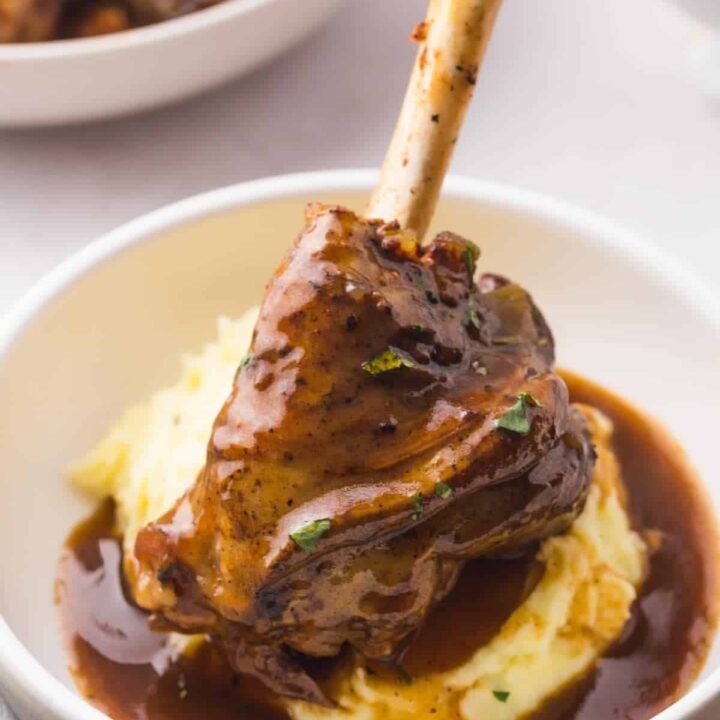 Instant Pot lamb shanks cookied with a red wine marinade until fork tender.