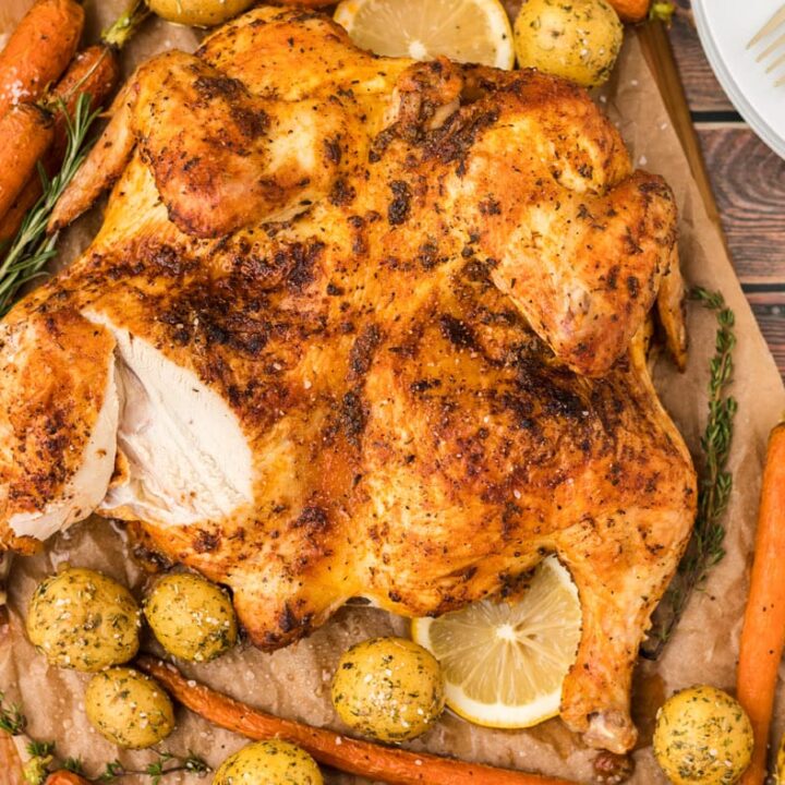Smoked whole chicken recipe made with a dry rub mix of spices to add flavor and help form a nice crispy crust on the skin.