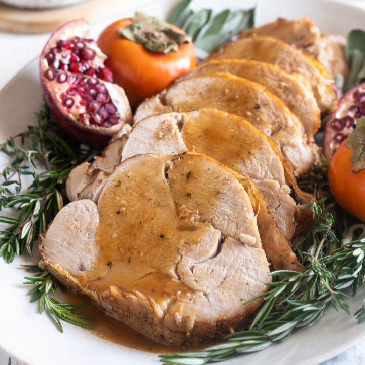 Yummy roasted turkey breast with garlic herb butter and gravy recipe.
