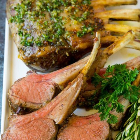 Rack of lamb is coated with garlic and fresh herbs, then roasted in the oven until tender and juicy