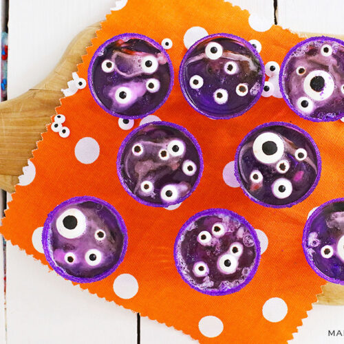 Place the eyes down into the gelatin. Use a drinking straw or skewers to push them down inside the gelatin.